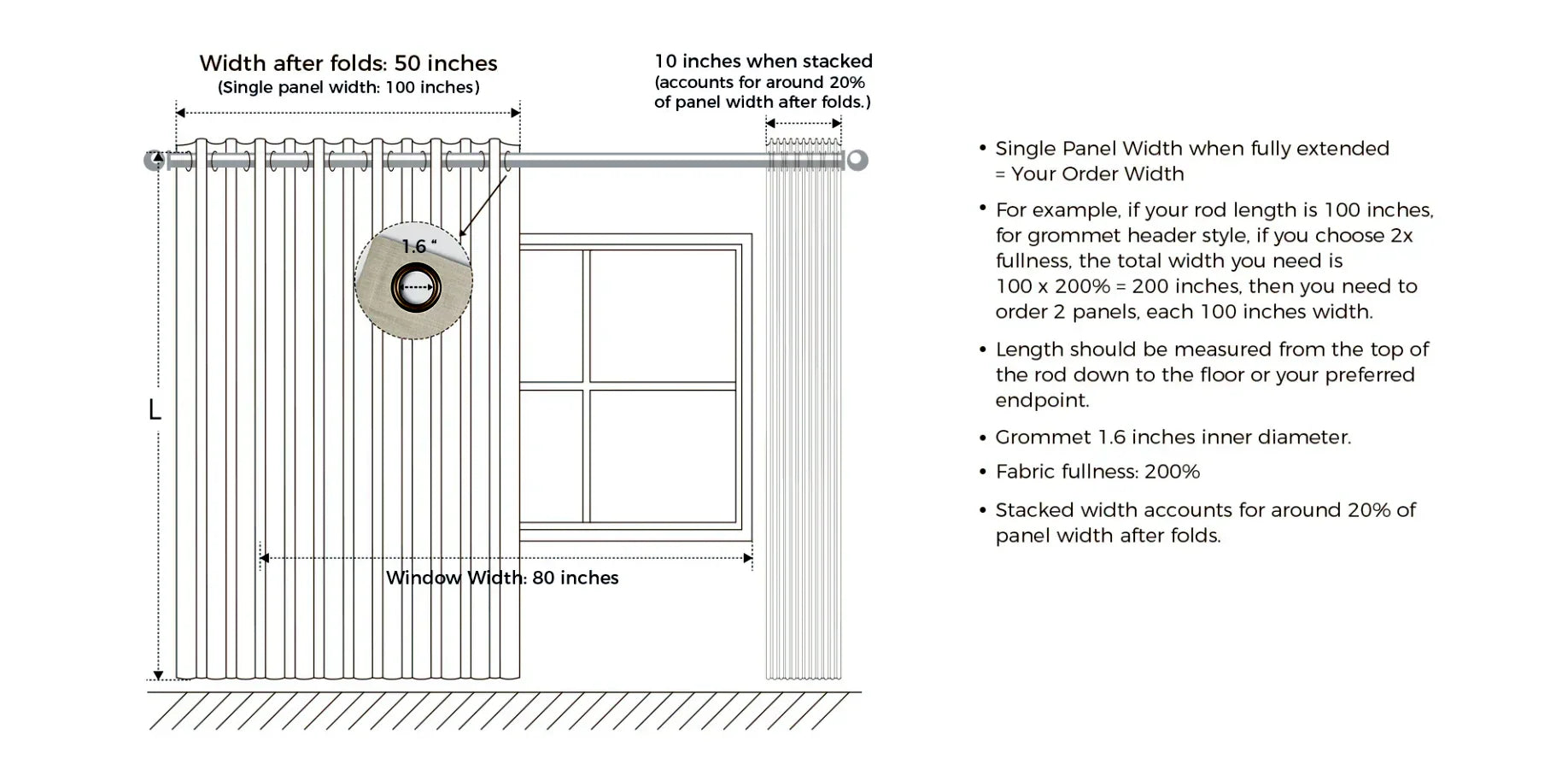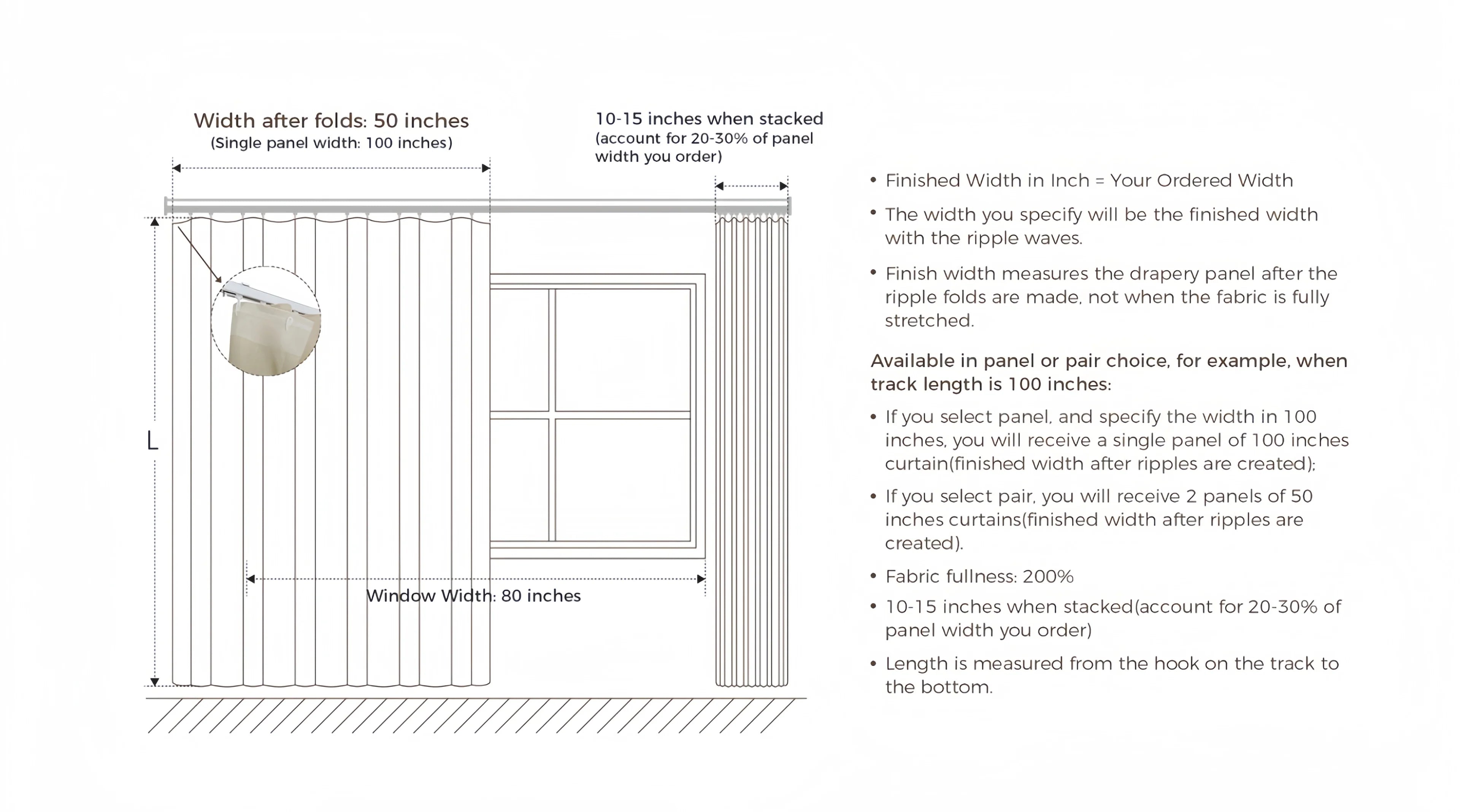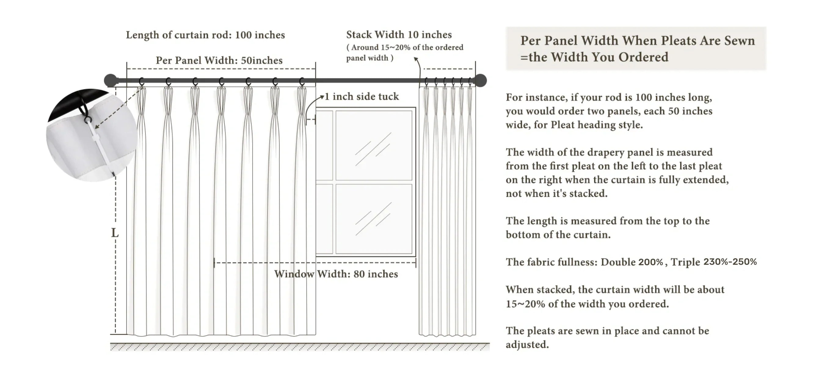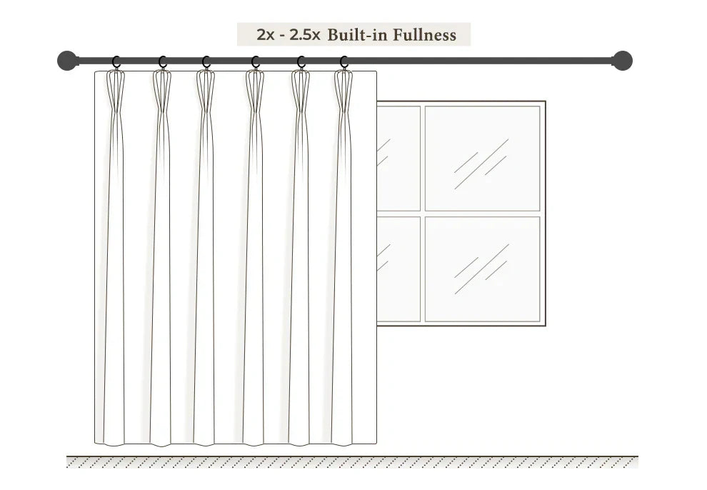 - 2.3x - 2.5x Fullness for triple pleat